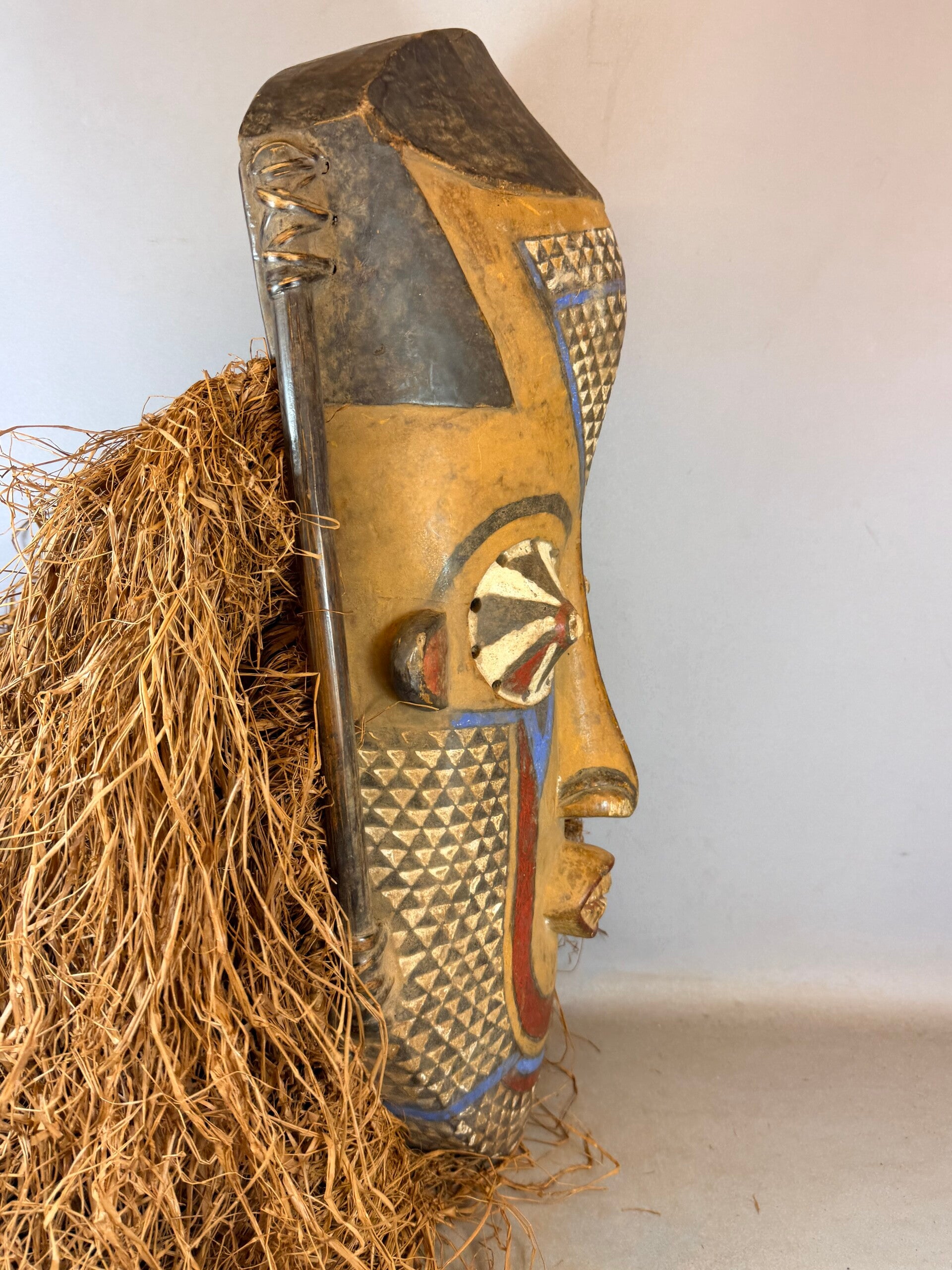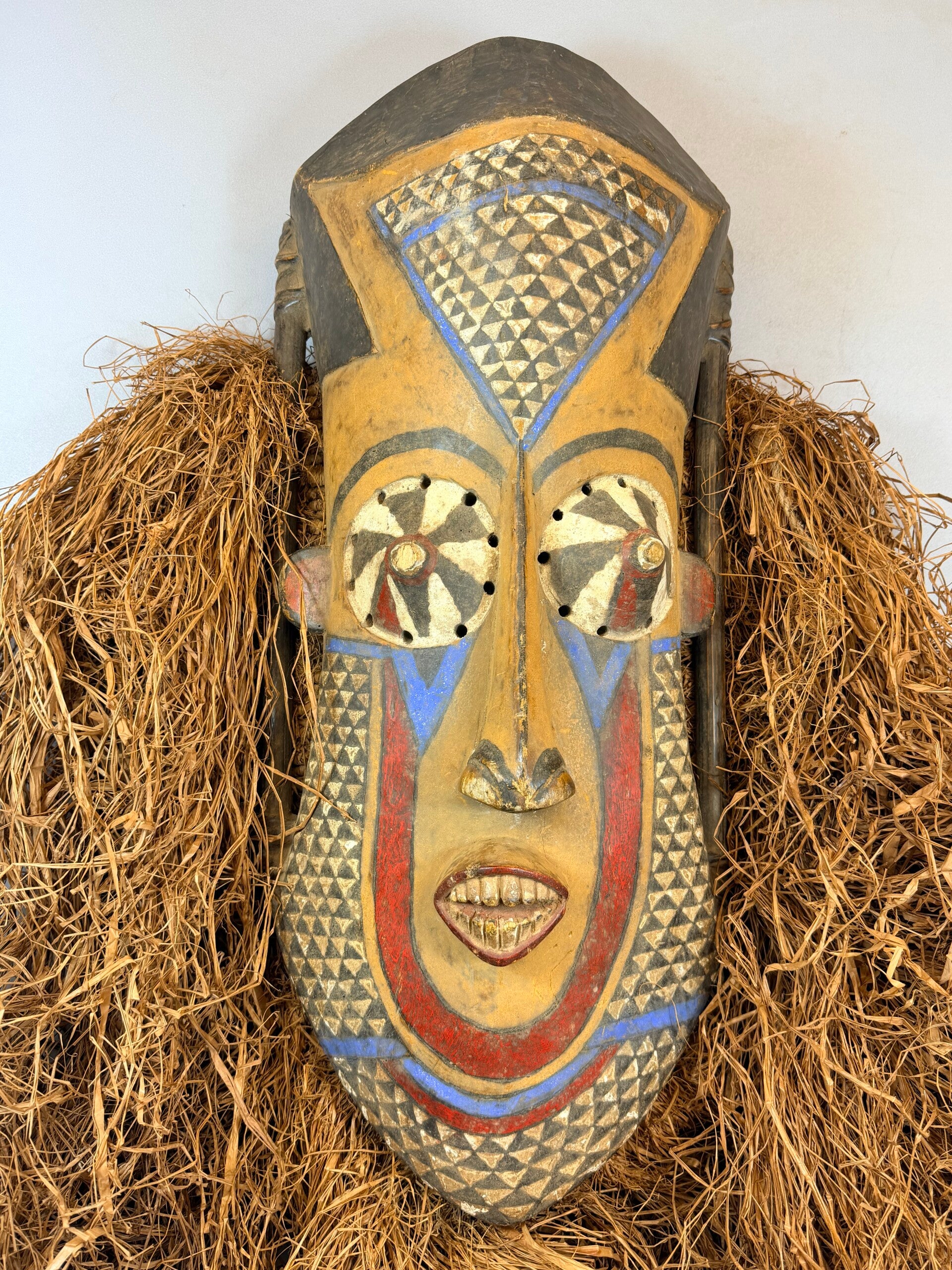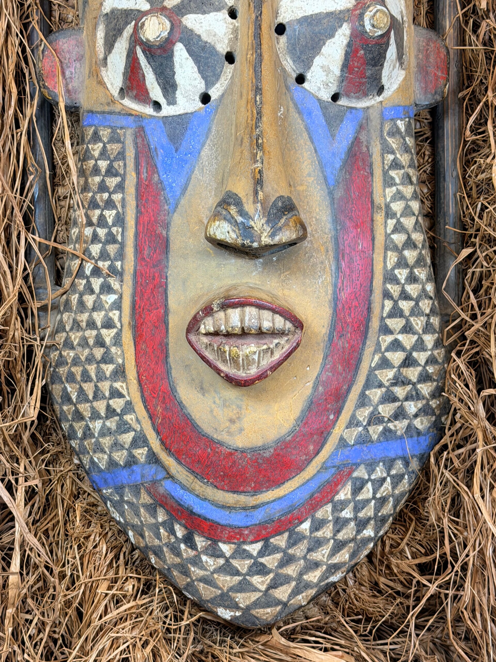 This facial mask belongs to the Pwoo Itok and Isheen Maal category of masks among the Kuba-Ngeende people. It exhibits distinctive features such as a prominent forehead, cone-shaped eyes, and multiple openings around the eyes reminiscent of a chameleon's vision. The mask features a large triangular nose.