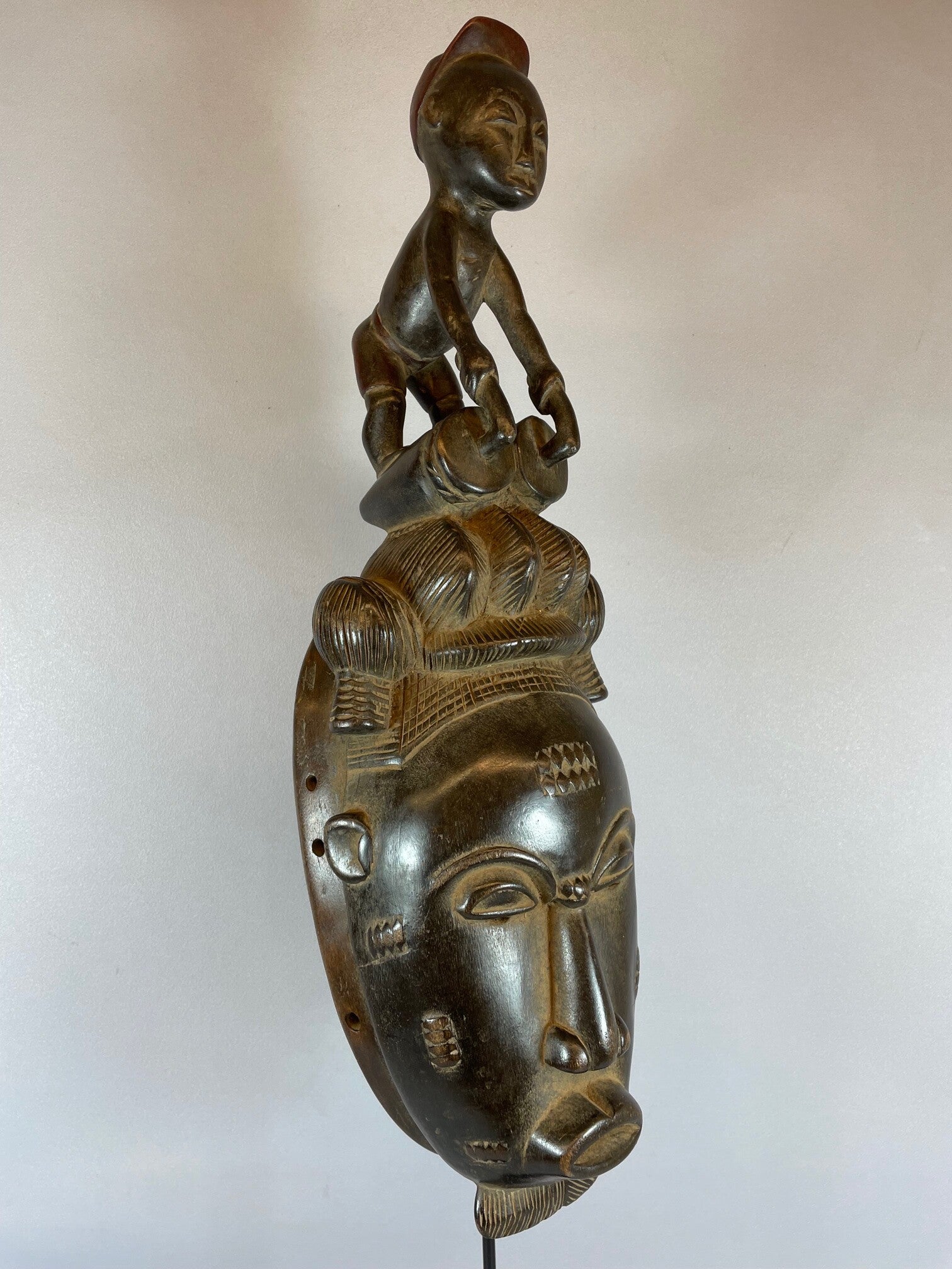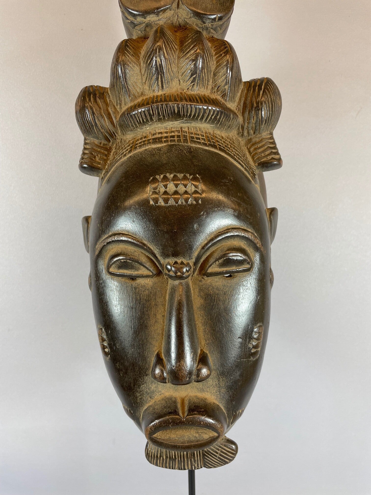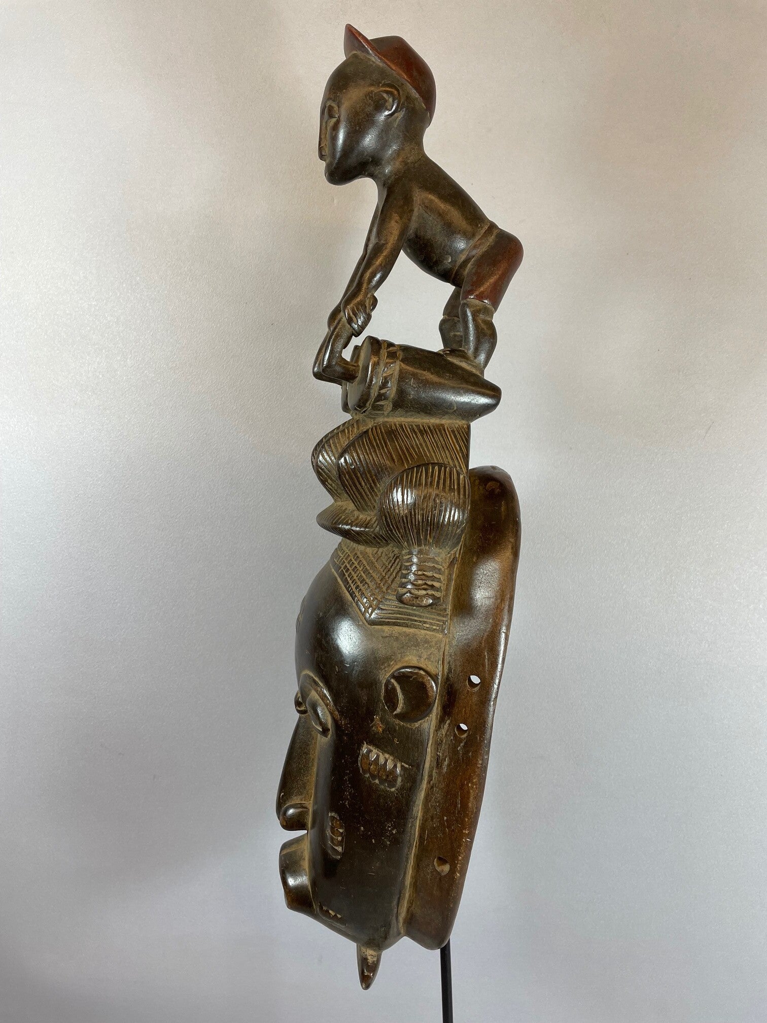 Iv. Coast: Rare and Old Tribal used African Baule mask with statue on top.
