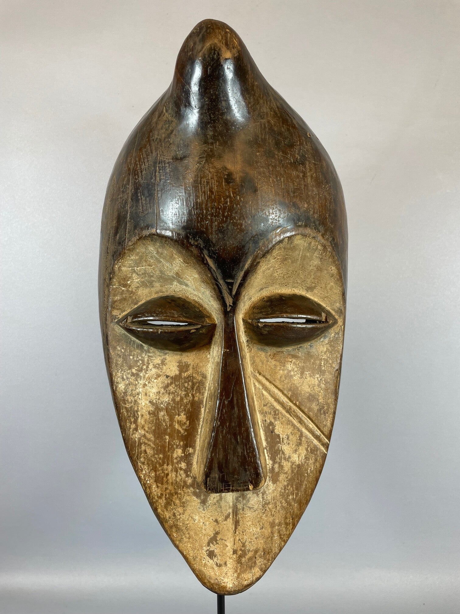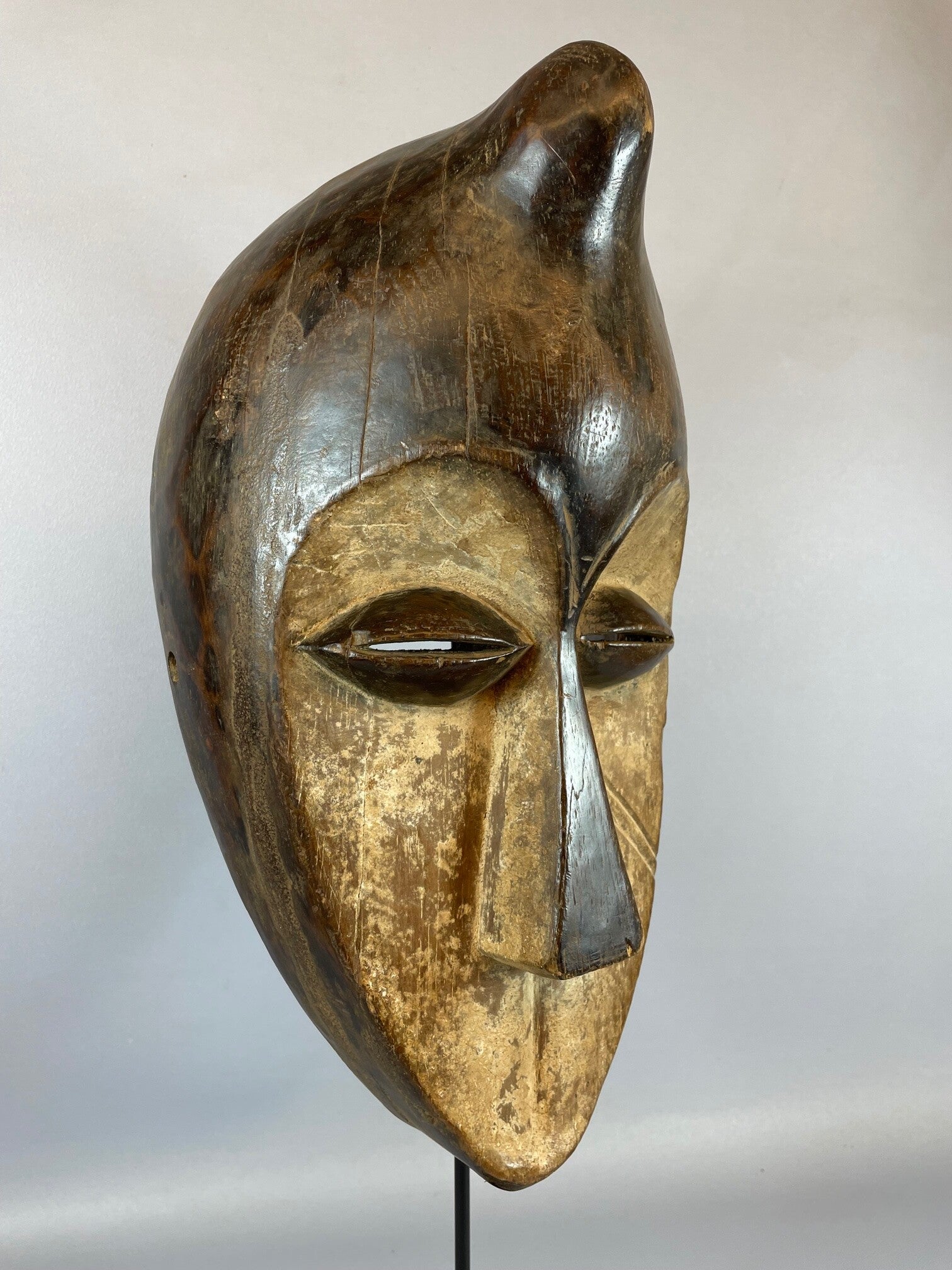 Mahongwe reliquary figures consist of three distinct sections: the oval, concave face with projecting top knot, the cylindrical neck, and an openwork base. The mouth is missing. The heads of these remarkable abstractions are large and do not have upper or side pieces. The base is of lozenge form. They are considered dangerous to handle because of their role in former funeral rites, which have not been practiced for over sixty years. Mahongwe masks are rare. 1
