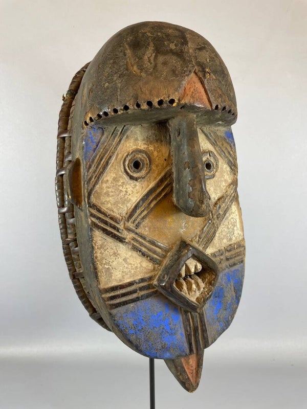 The masks represent the spirits of the bush. They are made in the shape of poles or in the form of animals. They are colored red, black, and white. The eyes protrude, surrounded by concentric circles, with a rather short snout on the animal masks, and a large and protruding mouth on the more abstract masks. They are decorated with geometric motifs, and often repainted. The wearer of the mask may be invisible underneath the fiber skirt and must behave as the animal does, imitating its gait. The mask’s role is important during ceremonies at the end of initiation, at the funerals of notables, and as entertainment on certain market days.