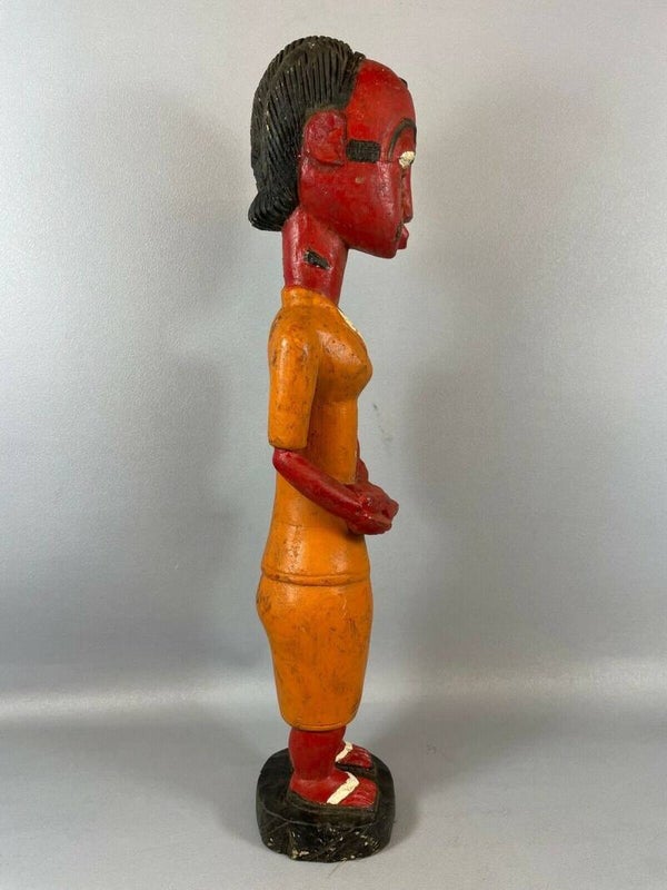The Baule people is one of the largest ethnic group in the Côte d'Ivoire. They have played a central role in twentieth-century history of the country. They waged the longest war of resistance to French colonization of any West African people, and maintained their traditional objects and beliefs longer than many groups in such constant contact with European administrators, traders, and missionaries. The Baule belong to the Akan peoples who inhabit Ghana and Côte d'Ivoire. According to a legend, during the eighteenth century, the queen, Abla Poku, had to lead her people west to the shores of the Comoe, the land of Senufo. In order to cross the river, she sacrificed her own son. This sacrifice was the origin of the name Baule, for baouli means “the child has died.” Now about one million Baule occupy a part of the eastern Côte d'Ivoire between the Komoé and Bandama rivers that is both forest and savanna land. Baule society was characterized by extreme individualism, great tolerance, a deep aversion toward rigid political structures, and a lack of age classes, initiation, circumcision, priests, secret societies, or associations with hierarchical levels. Each village was independent from the others and made its own decisions under the presiding presence of a council of elders. Everyone participated in discussions, including slaves. It was an egalitarian society. The Baule compact villages are divided into wards, or quarters, and subdivided into family compounds of rectangular dwellings arranged around a courtyard; the compounds are usually aligned on either side of the main village street.