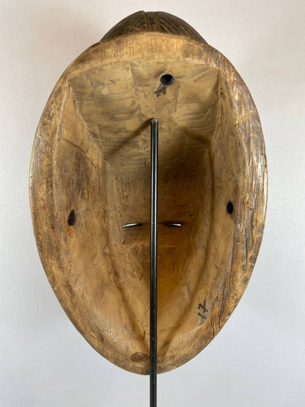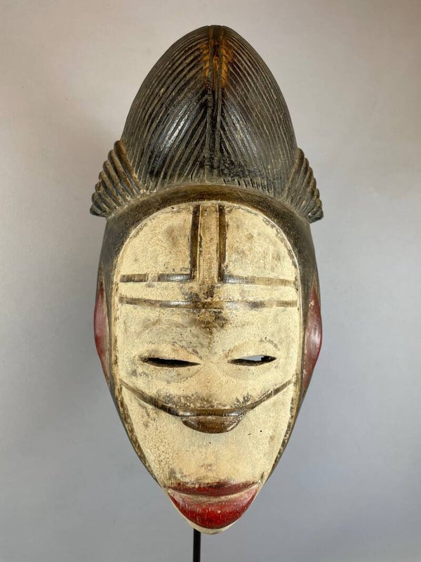 This mask is used by various tribes in Gabon. This one comes from the Punu. Mmwo Spirit Maiden Mask portrays a beautiful maiden with her whitened face and serene expression. As in life this beautiful maiden wears an elaborate hairstyle shown through polychrome colors. The mask would be worn with a colorful costume covering her body. Although the mask has an Asian expression, no such connection has been established. known as duma or mvudi, it represents a female guardian spirit in the initiation of young girls, funerary rites, ancestor cults, and also in dances of the full moon. At the burial ceremonies of the Puno society, the mask represented a female ancestor. In the Mukui (Moukouj, Mukuji) society, the masked performer, sometimes on stilts, performed at the dance of the full moon. (See Segy's MASKS OF BLACK AFRICA.) The refined features and elaborate coiffure of the Puno masks mirror the appearance of tribal women. Social cohesion is ensured by a society known as Moukouji, whose primary role is to subjugate harmful forest spirits. The white pigments on masks allude to the anti-witchcraft powers of this group. The Puno make only masks of women, with elaborate hairstyles, features which appear somewhat Asian, and white kaolin pigments. They are worn by Moukouji initiates, who are often on stilts. They are thought to represent ancestor's faces.