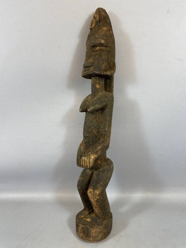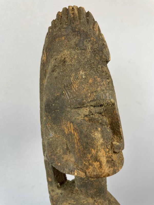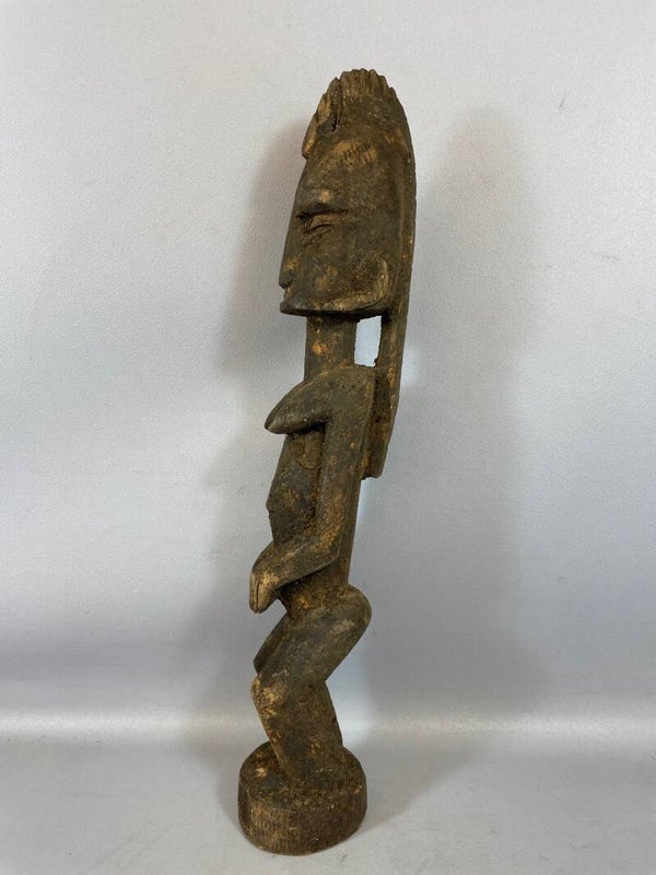 The 400,000 Dogon live 180 miles south of Timbuktu on the cliffs of Bandiagara, which dominate the plains for over 150 miles. They speak approximately 120 dialects, many of which are not mutually comprehensible. At first hunters, now on their small fields they cultivate millet, sorghum, wheat, and onion. The millet is stored in high quadrangular granaries around which they build their houses. Because of the difficult approach to these regions and the aridity of the climate, the Dogon have been isolated and hence were able to conserve their ancient religious habits and ways of making the necessary implements, their carvings.