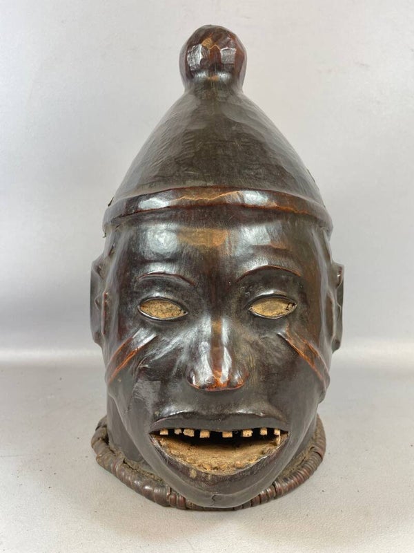 221214 - Antique Ekoi janiform head mask covered with hide Certificate - Nigeria.